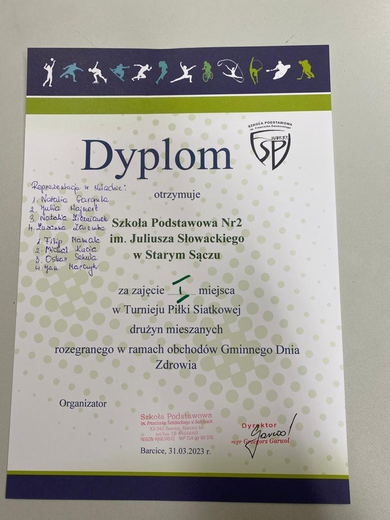 31.03.2023 roku w Szkole Podstawowej w Barcicach odbył się Turniej Piłki Siatkowej w ramach obchodów Gminnego Dnia Zdrowia. Turniej zorganizowany był dla klas 7-8. Każdą szkołę reprezentował zespół składający się z 3 dziewcząt i 3 chłopców. Reprezentacja naszej szkoły wygrała wszystkie mecze z SP Barcice, SP1, SP z Przysietnicy i z SP z Popowic.