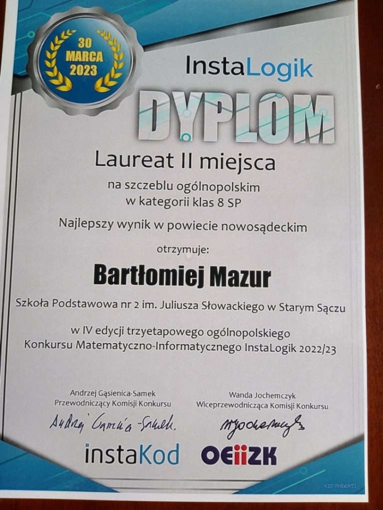 Bartłomiej Mazur zdobył tytuł Laureata II miejsca na szczeblu ogólnopolskim IV edycji trzyetapowego ogólnopolskiego Konkursu Matematyczno-Informatycznego InstaLogik 2022/23, uzyskując najlepszy wynik w powiecie nowosądeckim w kategorii klas 8. Uczeń zakwalifikował się do etapu wojewódzkiego małopolskiego konkursu informatycznego.