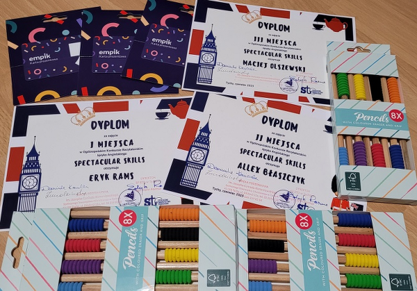 Serdecznie gratulujemy Erykowi, Maćkowi Alexowi i Oli ich doskonałych osiągnięć w konkursie „Spectacular Skills”. Ich niezwykłe miejsca w konkursie potwierdzają wyjątkowy talent, pasję i pracę, jaką włożyli w przygotowanie swoich recytacji. Życzymy im dalszych sukcesów w rozwijaniu swoich umiejętności recytatorskich i wykorzystywaniu swojego talentu w przyszłości. Ich osiągnięcia stanowią również inspirację dla innych uczniów, którzy pragną odkrywać i wyrażać swoje umiejętności artystyczne.