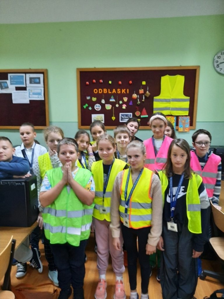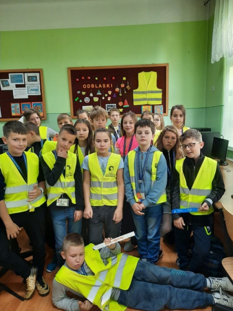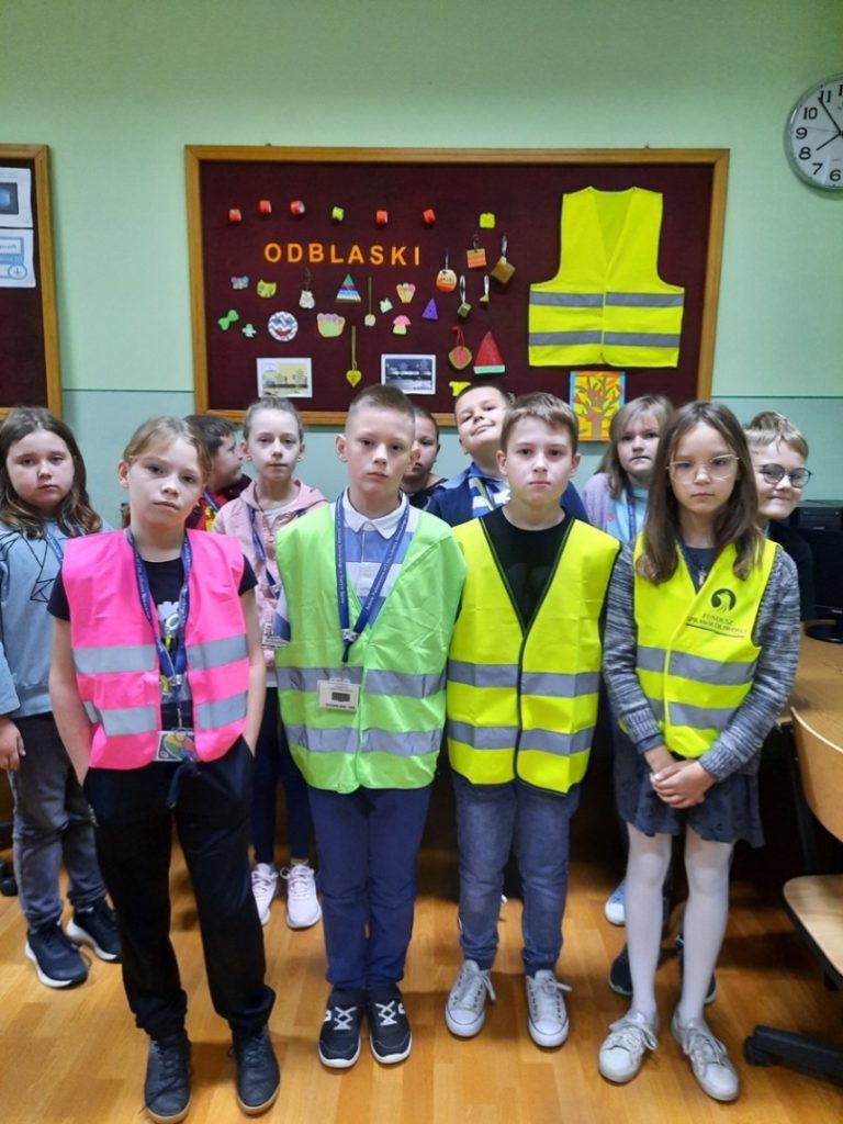 W wrześniu i październiku, w ramach akcji „Odblaskowa szkoła”, uczniowie klasy 4 i 5 projektowali i wykonywali znaki odblaskowe. Uczniowie obejrzeli prezentację pt. „Noś odblaski”. Dowiedzieli się, że najbardziej na niebezpieczeństwo na drodze narażone są osoby poruszające się po zmierzchu drogą poza obszarem zabudowanym. Zgodnie z przepisami ruchu drogowego osoby takie muszą mieć na sobie elementy odblaskowe widoczne dla innych uczestników ruchu. Dzieci opowiadały o zasadach bezpiecznego przechodzenia przez jezdnię i bezpiecznego poruszania się poboczem drogi. Podczas zajęć odbyły się pogadanki na temat korzyści wynikających z noszenia odblasków i kamizelek odblaskowych przez pieszych i przez rowerzystów po zmierzchu. Szczególnie narażeni na niebezpieczeństwo na drodze są osoby starsze oraz dzieci. Ze szczególnym ryzykiem wiąże się spacerowanie po zmroku oraz w terenie niezabudowanym, w którym często nie ma chodnika, a jedynie wąskie pobocze. W przypadku takich spacerów absolutnie niezbędne są dobrze widoczne odblaski umieszczone na ubraniach. Uczniowie obejrzeli przykładowe znaki i zwrócili uwagę na ich kolorystykę, kształt i zastosowanie. Następnie rysowali odblaski na kartkach i wykonywali odblaski z różnych materiałów, które zostały umieszczone na plecakach i gazetce szkolnej. W domu dzieci informowały swoich rodziców, dziadków i babcie o tym jak należy zadbać o swoje bezpieczeństwo na drodze po zmierzchu i jaką rolę pełnią elementy odblaskowe.