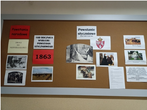 – uczniowie przygotowali gazetkę ścienną poświęconą lokalnym bohaterom ważnym dla naszego kraju pt. „W 160 rocznice wybuchu Powstania Styczniowego ochotnikom z zaboru austriackiego, mieszkańcom Starego Sącza i okolic”. Rok 2023 został ustanowiony Rokiem Powstańców Styczniowych.