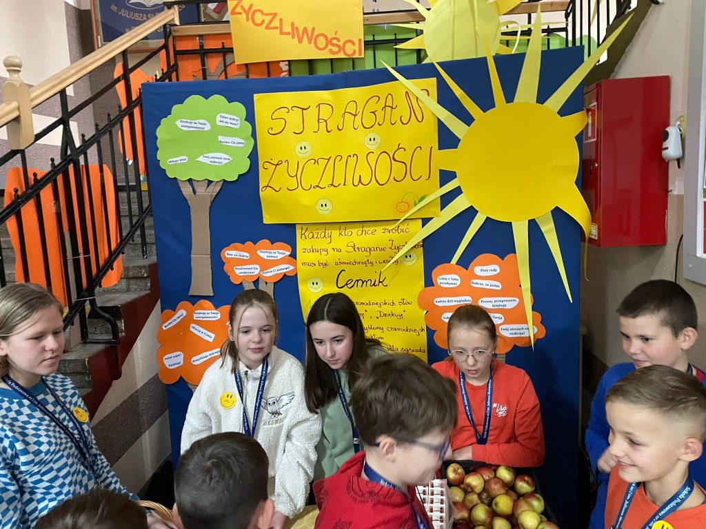 Wszystkie klasy otrzymały również papierowe promienie słońca, na których wypisywały hasła dotyczące życzliwości wobec innych w codziennym życiu. Wszystkie klasowe promienie wzbogaciły gigantyczne słońce, które rozświetliło szkolne korytarze swoim symbolicznym ciepłem. Życzliwe hasła wymyślone przez wszystkie klasy i znajdujące się na promieniach słońca nie tylko zdobiły korytarze szkolne, ale zachęcały do rozsiewania życzliwości i dobroci wokół nas.