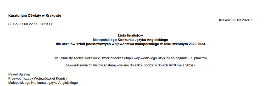 Miło nam poinformować, iż uczeń klasy VI a, Karol Stawiarz uzyskał tytuł finalisty Małopolskiego Konkursu Języka Angielskiego dla uczniów szkół podstawowych w roku szkolnym 2023/2024.