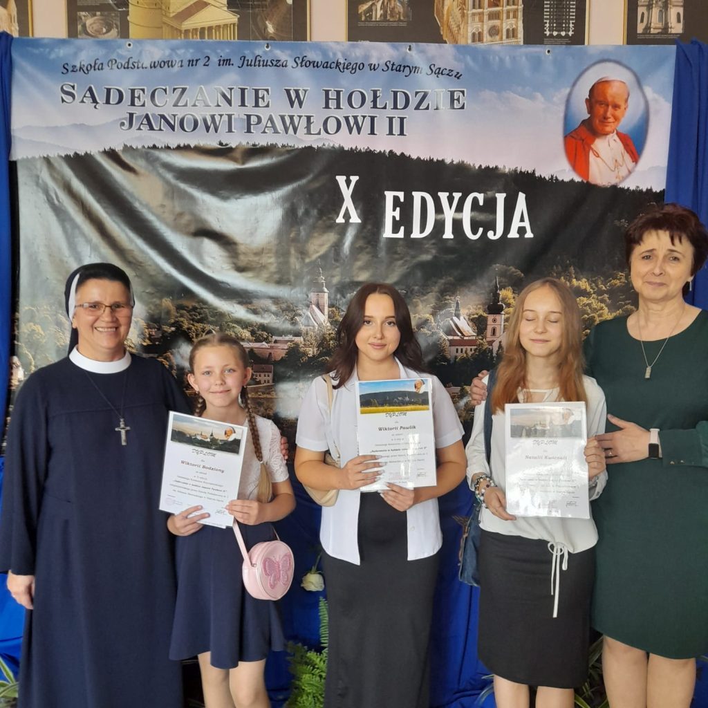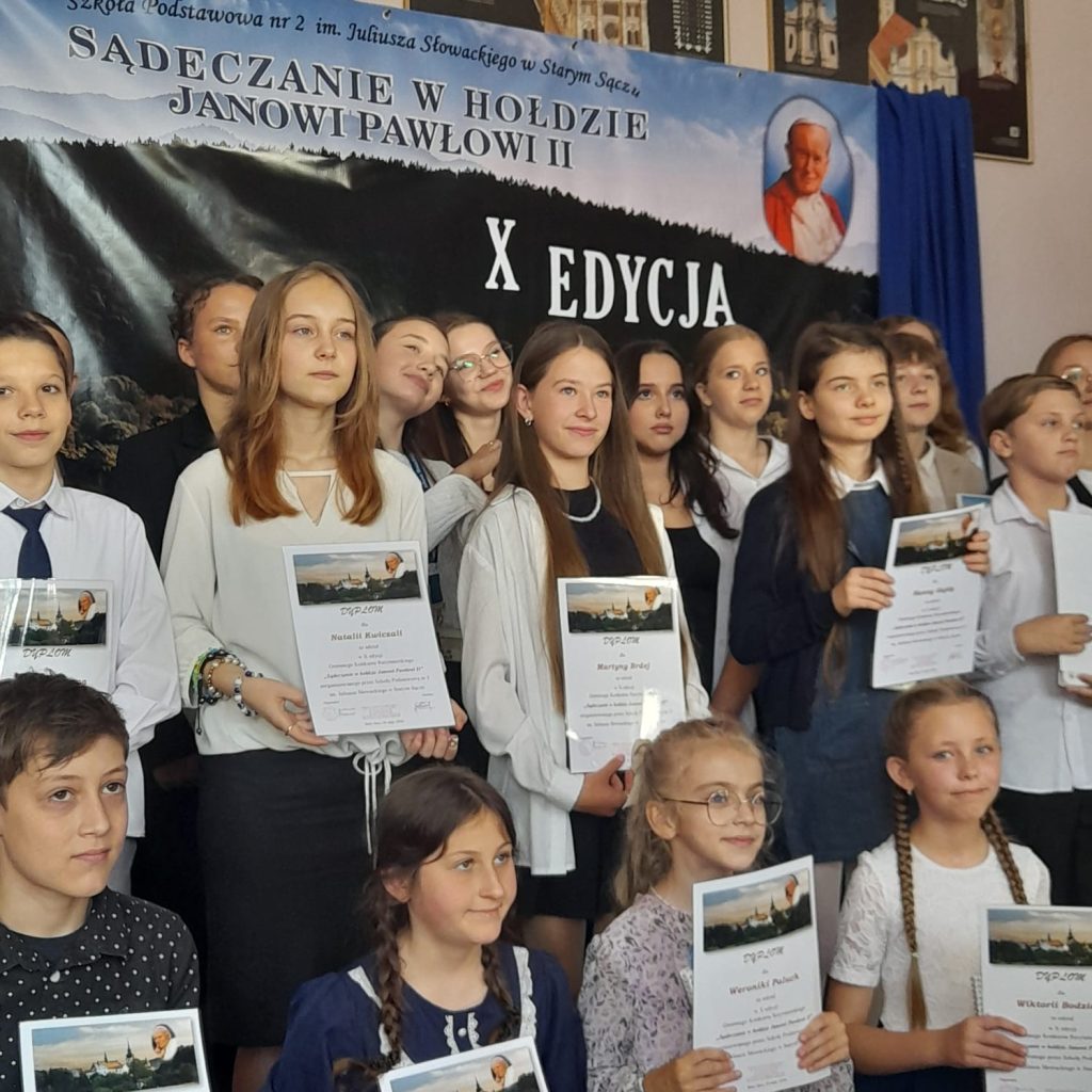 16 czerwca 2024 roku minie 25. rocznica pobytu Jana Pawła II w Starym Sączu i kanonizacji Świętej Kingi. Dlatego też tegoroczna edycja konkursu „Sądeczanie w hołdzie Janowi Pawłowi II ” była dla organizatorów – Szkoły Podstawowej nr 2 im. Juliusza Słowackiego w Starym Sączu – ważna i wyjątkowa. Jej motto przewodnie brzmiało: „Pamiętamy i wspominamy! 16 czerwca 1999 – to już 25 lat!”.
