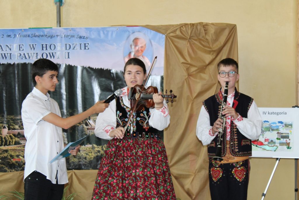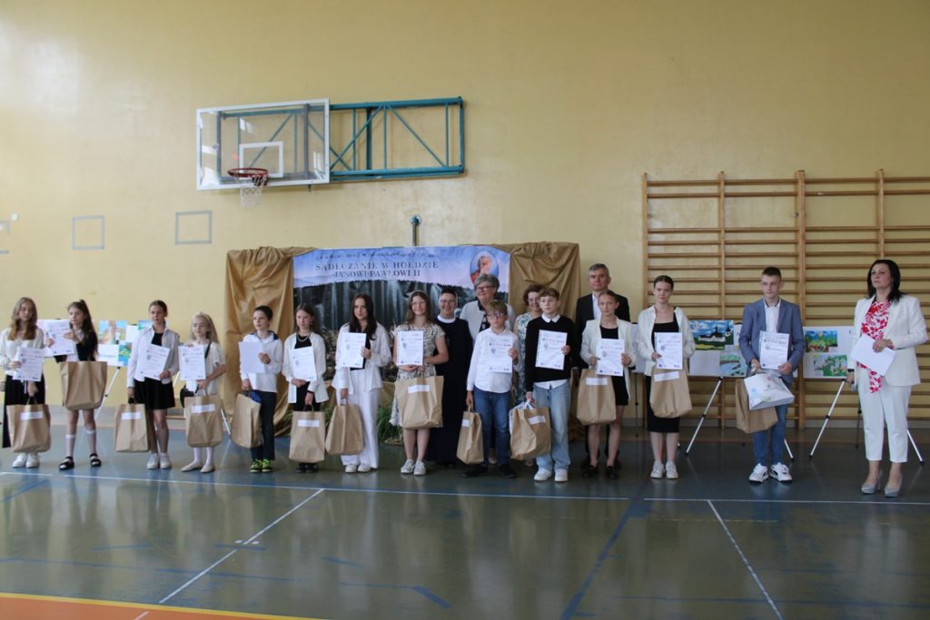 W miniony piątek 7 czerwca nasza szkoła obchodziła wyjątkowe święto patrona -JuliuszaSłowackiego, ten uroczysty dzień stał się też okazją, aby upamiętnić 25 rocznicę wizyty Ojca Świętego Jana Pawła II w Starym Sączu. Obchody rozpoczęły się od mszy świętej, następnie odbyła się akademia w której uczestniczyła cała społeczność szkolna oraz zaproszeni goście: burmistrz Starego Sącza Pan Jacek Lelek, przewodniczący Rady Rodziców Piotr Dyrek, ksiądz proboszcz Janusz Ryba, panie Danuta Hejmej, Jolanta Chruślicka, Agata Miczołek, Katarzyna Biel-Tokarczyk a także Siostra Alicja Zielińska. Zgromadzonych przywitała Pani Dyrektor Wioletta Nowak podkreślając wyjątkowe znaczenie obchodzonego święta, w którym rocznica wizyty Ojca Świętego połączyła się z X jubileuszową edycją konkursu „Sądeczanie w hołdzie Janowi Pawłowi II”. Podczas akademii mieliśmy okazję wysłuchać montażu słowno-muzycznego, w którym przywołana została pamięć wieszcza narodowego Juliusza Słowackiego, nie mogło też zabraknąć słów poety które wiele lat temu proroczo przepowiadały nadejście „Słowiańskiego Papieża”. Następnie przyszedł czas na wspomnienia ze starosądeckich błoni z dnia 16 czerwca 1999 roku, z niemałym wzruszeniem zgromadzeni wysłuchali „powtórki z geografii” i serdecznego śpiewu „Życzymy, życzymy”. Na zakończenie uroczystości miała miejsce wyjątkowa chwila, zostały wręczone pamiątkowe dyplomy i atrakcyjne nagrody dla zwycięzców i wyróżnionych w konkursie „Sądeczanie w hołdzie Janowi Pawłowi II”.