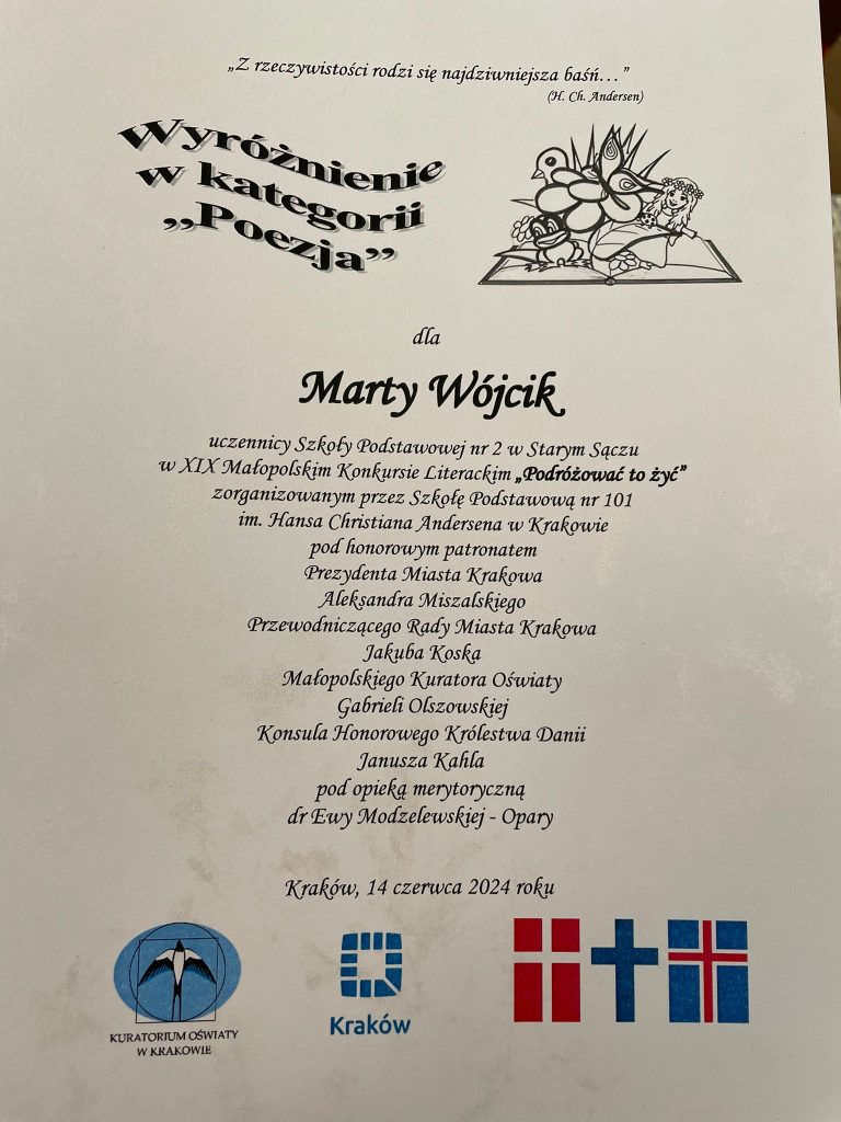 A oto wiadomość z ostatniej chwili. Wielkie brawa dla Marty Wójcik z klasy 5a, która zdobyła na szczeblu wojewódzkim WYRÓŻNIENIE w XIX Małopolskim Konkursie Literackim „Podróżować to żyć.” W piątek, 14 czerwca 2024 roku, Marta wzięła udział w uroczystej gali finałowej konkursu, która odbyła się w Sali Miedzianej Muzeum Historycznym Miasta Krakowa. Piękny wiersz Marty pt. „Ścieżki do wnętrza”, który skłania do refleksji, został odczytany podczas trwania gali finałowej konkursu w Krakowie.