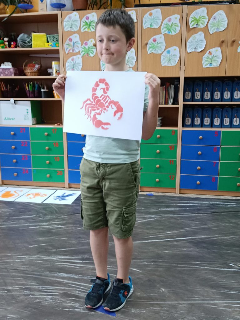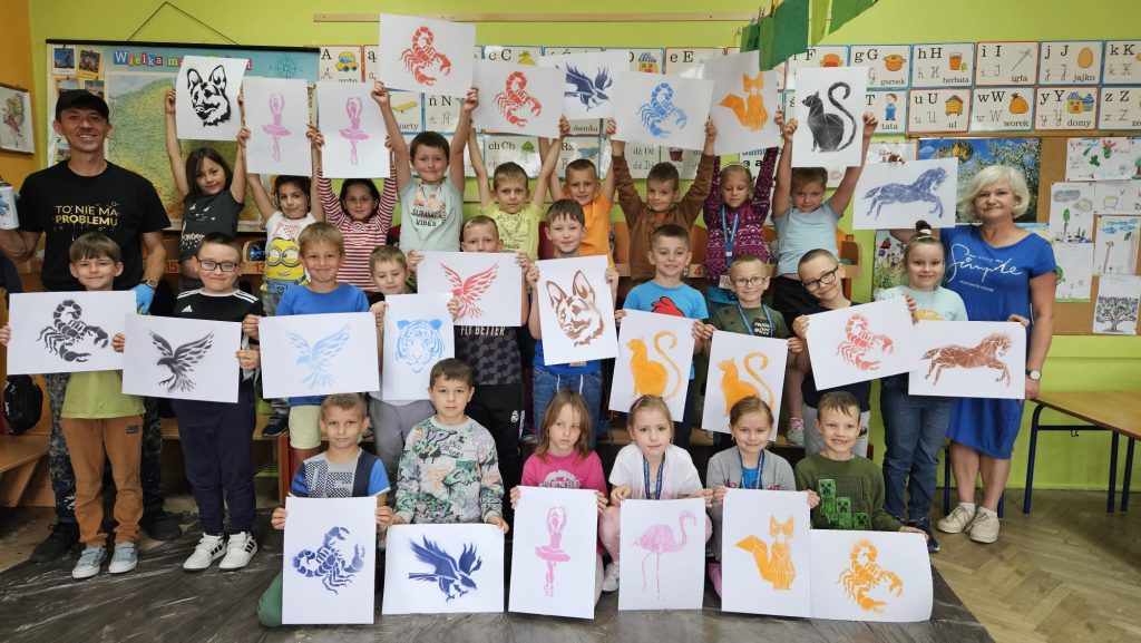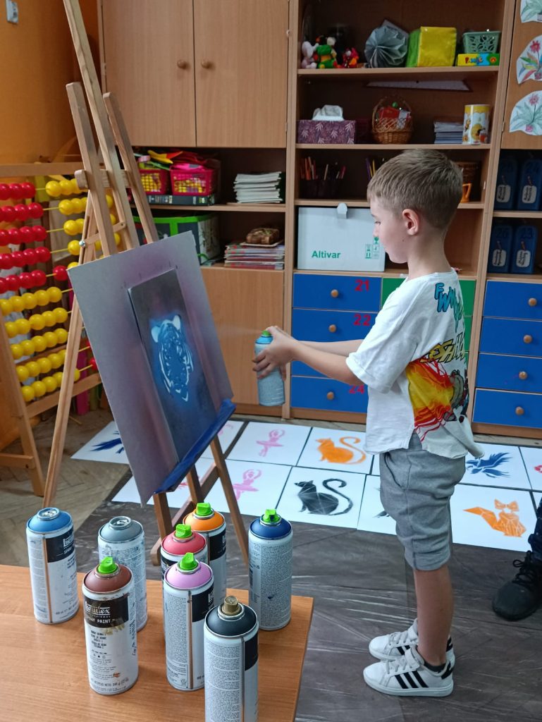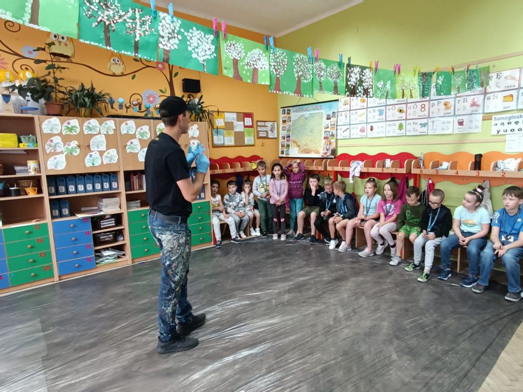Doradztwo zawodowe w pierwszej klasie? Czemu nie! Przecież już od najmłodszych lat dzieci mogą poznawać ciekawe zawody dorosłych. Takim bardzo interesującym rozmówcą okazał się być tata jednego z uczniów naszej klasy 1B – pan Mariusz Brodowski, znany artysta malarz, twórca murali, działacz społeczny, animator i edukator. Mieliśmy zaszczyt gościć w klasie tak niezwykłą osobę 12 czerwca. Pseudonim artystyczny p. Mariusza to MGR MORS i pod nim jest znany w Polsce i w świecie. Pan Mariusz, absolwent Uniwersytetu Śląskiego na kierunku Edukacja artystyczna w zakresie sztuk plastycznych, specjalizacja malarstwo, doskonale odnalazł się w trudnej sztuce graffiti. Dzieci miały możliwość zapoznania się z jego pracą poprzez opowieści i prezentację multimedialną. Potem nastąpiła część dla dzieciaków z pewnością najprzyjemniejsza – tworzenie własnych prac. Pan Mariusz i jego żona, p. Karolina Brodowska, pseudonim KARO, również uznana graficzka, twórczyni murali i ilustracji do książek, autorka cyklu bajkowych stworzeń – Cudaków, przynieśli ze sobą odpowiednie kartki, mnóstwo pięknych szablonów i farby w sprayu. Każde dziecko, po uprzednim instruktażu, zapoznaniu się z końcówkami do farb i ich nazwami, mogło wykonać, jak prawdziwy grafficiarz, swój własny obraz wybranego zwierzęcia lub człowieka. Zabawa była przednia, prace piękne, kolorowe i niezwykłe. Trafiły do domów i pewnie zajmą poczytne miejsce na ścianach dziecięcych pokojów.