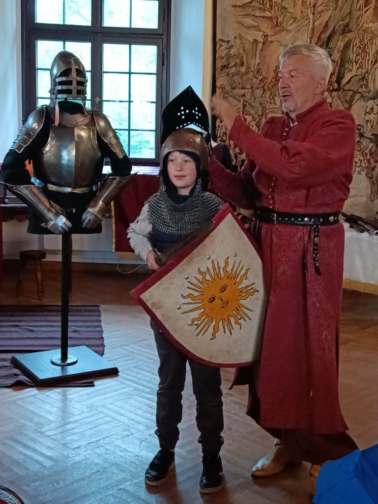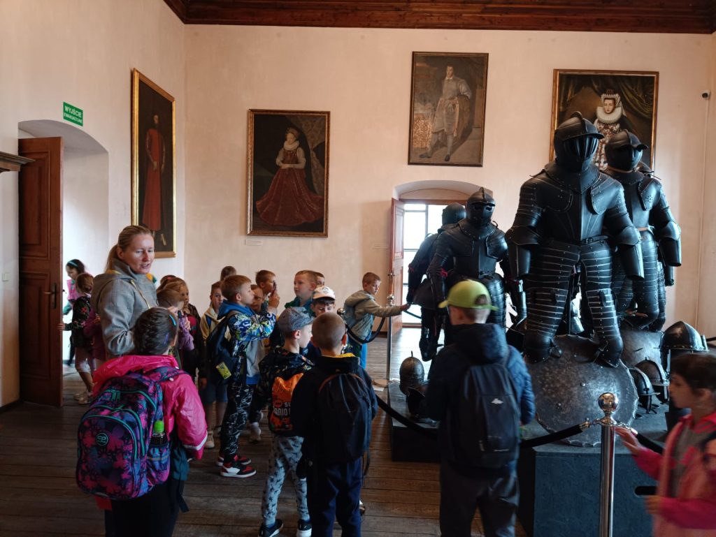 13 czerwca pogoda nie zachęcała do wyjścia na dwór. Ale my przecież nie jesteśmy zrobieni z mydła i nam deszcz niestraszny. Wobec tego wyruszyliśmy w doskonałym nastroju przywitać Białą Damę, ducha rezydującego na zamku w Nowym Wiśniczu. W drodze do celu zapoznaliśmy się z legendami zamczyska. Szczególnie, oprócz legendy o złośliwej królowej Bonie, która na osiołku pokonała gzyms na wysokiej wieży, legendy o komnacie szeptów, gdzie właściciel zamku podsłuchiwał tajemnice spowiedzi swoich poddanych i rodziny, zaintrygowała nas legenda o skarbie, bo przecież jednym z punktów naszego programu miało być jego poszukiwanie. Oprócz deszczu przywitało nas „latanie z nietoperzami” – trójwymiarowe zwiedzanie zamku za czasów średniowiecza. Potem ruszyliśmy do zamkowych piwnic poszukiwać z latarkami zagubionego skarbu Barbary. Zadań do wyszukania i odgadnięcia było wiele, ale cóż to dla nas spryciarzy – skarb został odnaleziony i sprawiedliwie podzielony – każdy „uszczknął” po kawałeczku dostając piękny wisiorek z kamieniem „szlachetnym” na szyję. Przy okazji poszukiwania skarbu zwiedziliśmy cały zamek: widzieliśmy przepiękną komnatę „pod chmurkami”, gdzie na suficie było cudne niebo zamknięte w kasetonach, wypróbowywaliśmy komnatę szeptów i rzeczywiście magia podsłuchu działała, podziwialiśmy stroje z epoki, zbroje rycerskie oraz makiety z różnych okresów zamku. Było co oglądać! Uwieńczeniem naszego zwiedzania były warsztaty rycerskie, które prowadził prawdziwy sarmata, z wielkim wąsem, ubrany w kontusz szlachecki. Po krótkim wykładzie historycznym, w zabawny sposób przekazywał nam historię broni białej od czasów Neandertalczyka po czasy wojen XVI i XVII wieku. Przy okazji nasi chłopcy posłużyli za modeli demonstrujących ubiory ówczesnych rycerzy, a panienki odegrały wraz z nimi bitwę z czasów króla Stefana Batorego. Później śmiałkowie ćwiczyli pod okiem mistrza, walki mieczami i szablami, oczywiście nie ze stali tylko z materiałów nie zagrażających ich życiu i zdrowiu J Były też wspólne tańce i prezentacje naszego „szlachcica” miotania kulami i strzelania z broni. Nasz pobyt na zamku zakończyliśmy zakupami pamiątek i wróciliśmy do „płaczącego za nami deszczem” Starego Sącza.