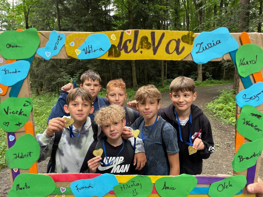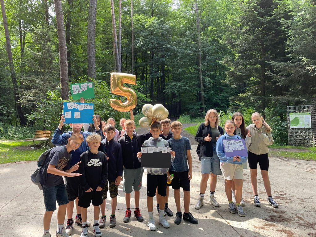 A potem ruszamy dalej, by zanim wkroczymy do lasu opowiedzieć o swoich trzech wakacyjnych marzeniach, a do snucia marzeń inspirują nas trzy małe chmurki, które wychowawca rozdaje uczniom. Idziemy dalej aż docieramy do leśnych ścieżek, a tam odnajdujemy cztery drewniane ławeczki i tworzymy czteroosobowe drużyny, by podczas wspólnej zabawy wrócić wspomnieniami do różnych chwil, które przeżyliśmy w klasie piątej. I tak oto rozpoczynają się zagadki przygotowane przez wychowawcę, a zamiast punktów pani Teresa Tokarczyk przykleja papierowe motyle na czterech tablicach punktowych. Uczniowie nie mieli żadnych trudności z wymienieniem osób, które w Dniu Życzliwości obsługiwały Stragan Życzliwości na szkolnym korytarzu; podaniem imienia osoby, która podczas wigilii klasowej pięknie zagrała na skrzypcach lub imienia kolegi, który w tym roku był naszym klasowym Świętym Mikołajem. W tej rywalizacji nie było zwycięzców, liczyła się bowiem dobra zabawa i choć punkty w kształcie motyli symbolizowały ulotność chwil to wychowawczyni przypomniała uczniom jak ważne jest to, by zawsze wracać wspomnieniami do wspólnie przeżytych chwil, bo one łączą.