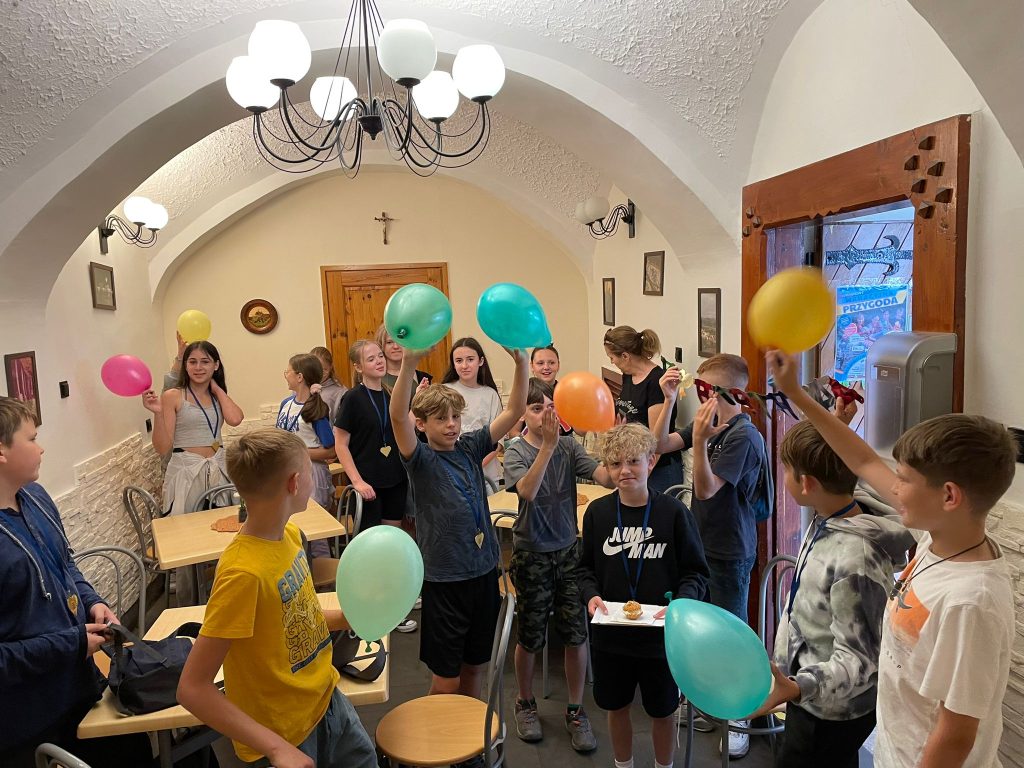 I znów ruszyliśmy leśnymi ścieżkami, by na kolejnych ławeczkach otrzymać od wychowawcy listę wakacyjnych pomysłów i ponownie opowiadaliśmy o nietypowych, chociaż jednocześnie takich zwyczajnych, planach na wakacje, a wśród nich pojawiły się takie jak puszczanie baniek mydlanych, wieczór filmowy, czytanie książki, poszukiwanie najsłodszego arbuza czy też tworzenie bukietu z polnych kwiatów. Z głowami pełnymi wakacyjnych planów ruszyliśmy dalej i zanim dotarliśmy do kolejnego zakrętu na naszej leśnej wędrówce, usiedliśmy na ławkach i odpowiadaliśmy na zagadki dotyczące znajomości życia i twórczości patrona naszej szkoły, Juliusza Słowackiego. Za poprawne odpowiedzi uczniowie otrzymywali kolorowe balony, które miały się jeszcze wkrótce przydać, bo po opuszczeniu lasu powędrowaliśmy prosto do Cukierni Jeziorek, bo tam czekała na całą klasę niespodzianka przygotowana przez Wiktora Koronę, który dzisiaj obchodził swoje urodziny.