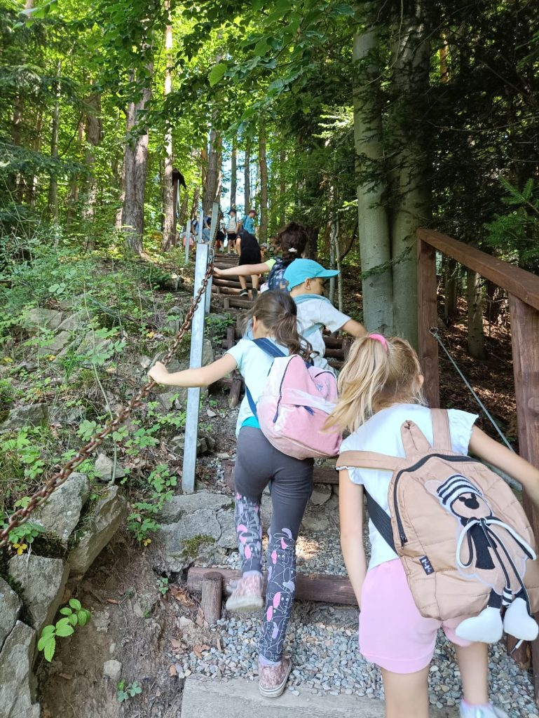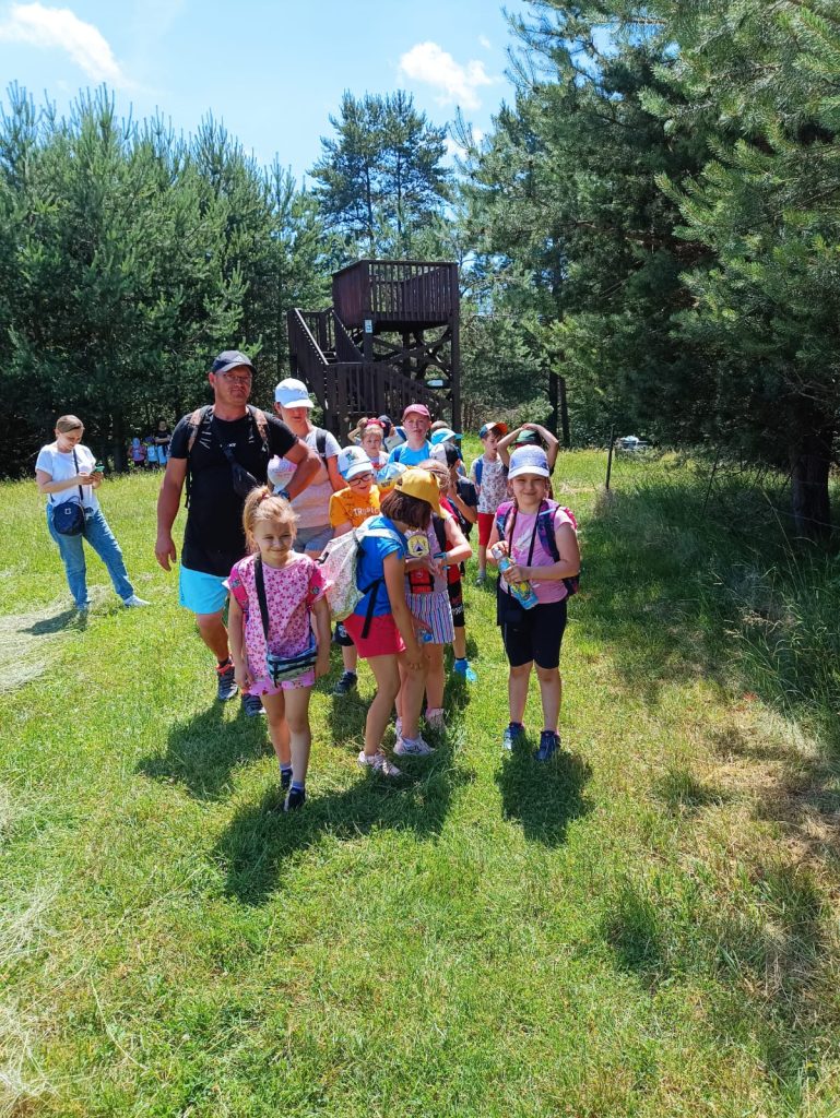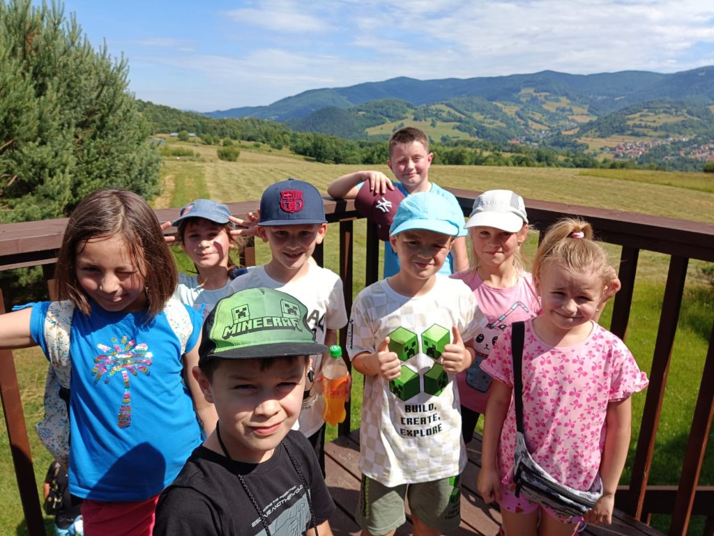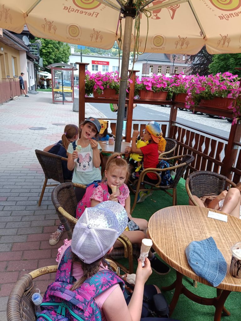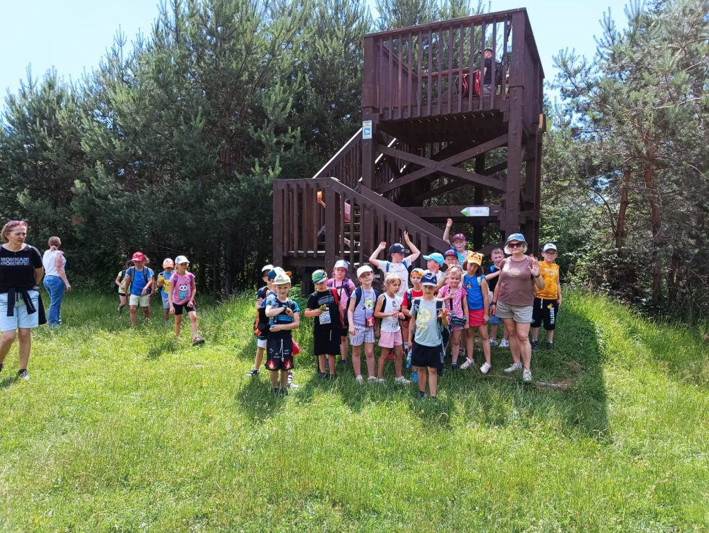 Klasa 1B postanowiła odbyć lekcję przyrody i historii w terenie. Tym razem pogoda sobie przypomniała, że do lata zostały tylko 4 dni i słoneczne ciepełko zagościło w Starym Sączu. Wykorzystując ten dogodny prąd pogodowy nasza klasa przeniosła się do Piwnicznej Zdroju. Wsiedliśmy do pociągu, a dla niektórych była to pierwsza jazda tym środkiem transportu. Piwniczna powitała nas upałem, więc przemykając między promieniami i korzystając z cienia, wyruszyliśmy podziwiać panoramę miasta z niewielkiej wieży widokowej. Szliśmy łąką i przypominaliśmy sobie, jak pani opowiadała o wypalaniu traw i zaśmiecaniu terenu. Wiemy już, że tego robić nie wolno. Za wieżą chowały się poniemieckie okopy wojskowe, które przeszliśmy w każdą stronę natykając się na żołnierzy strzelających z karabinów. Dobrze, że to były tylko makiety. Następny przystanek to polana z altanami i placem zabaw. Tam nagle przestały nas boleć nogi i daliśmy upust naszej energii. Czekał nas jeszcze jeden przystanek w parku Węgielnik-Skałki. Była to platforma widokowa zawieszona nad urwiskiem. Żeby do niej dojść musieliśmy podzielić się na mniejsze grupki, które trzymając się łańcuchów wspinaczkowych schodziły w dół na metalowy punkt widokowy. Czuliśmy się jak prawdziwi taternicy wchodzący na Giewont! Widok z platformy był niesamowity. Auta wyglądały jak pudełka od zapałek. Okoliczne góry też robiły wrażenie. Gdy zeszliśmy szczęśliwie do centrum miasta czekały nas pyszne lody we Florencji. Oczywiście nie tej we Włoszech, ale kawiarence w Piwnicznej o takiej nazwie. Pamiątki jak zwykle należało zakupić. Dobrze, że niektórzy, jak np. Michałek, pamiętali przy zakupach również o swoim rodzeństwie. Na koniec czekała nas jeszcze jedna niespodzianka: plac zabaw, tym razem przy samej stacji PKP. Zmęczeni, ale radośni, wyruszyliśmy z powrotem do Starego Sącza. A wycieczkę najfajniej podsumował nasz drugi Michałek, mówiąc z uśmiechem: „Ja to oceniam tą wycieczkę na mocne 8plus”.