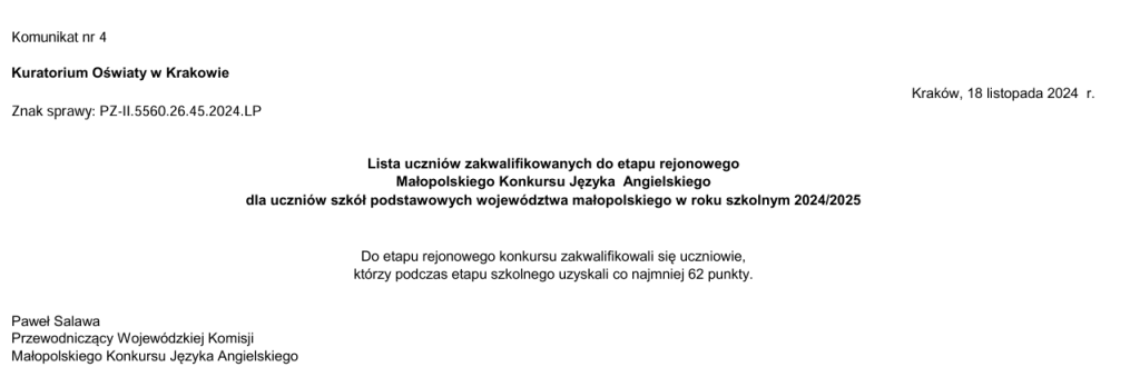 Wymienieni uczniowie podczas etapu szkolnego Małopolskiego Konkursu Języka Angielskiego uzyskali wynik uprawniający do udziału w etapie rejonowym.