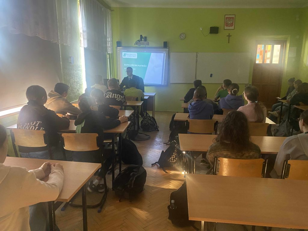 Dnia 12.02.2025r. w naszej szkole odbyło się spotkanie Prezesa Banku Spółdzielczego w Starym Sączu Pana Wiesława Klaga z uczniami klas 7, które zostało zorganizowane i poprowadzone przez szkolną drużynę Narodowego Banku Polskiego (NBP). Spotkanie miało na celu edukację młodzieży w zakresie cyberbezpieczeństwa oraz uświadomienie im zagrożeń związanych z korzystaniem z usług finansowych online. Spotkanie rozpoczęło się od krótkiego wprowadzenia, w którym przedstawiciele szkolnej drużyny NBP przywitali uczniów oraz zapoznali ich z tematem przewodnim – cyberbezpieczeństwem w finansach. Następnie głos zabrał prezes banku, który w przystępny sposób opowiedział o najczęstszych zagrożeniach, takich jak phishing, malware czy skimming, oraz o praktycznych metodach ochrony danych finansowych.
