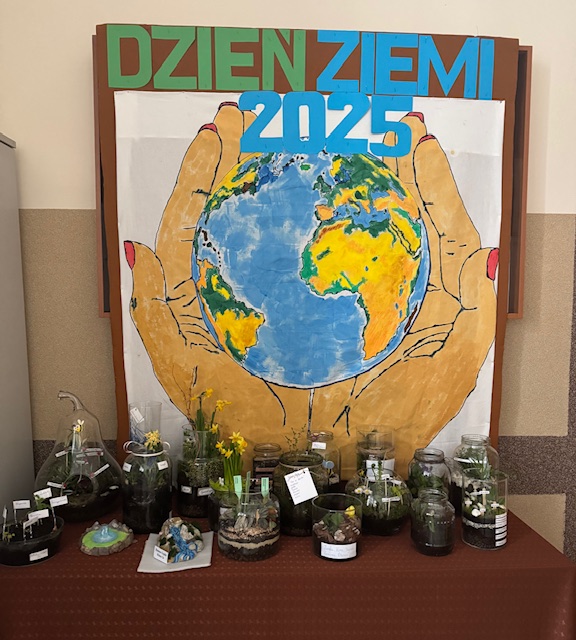 Młodsi uczniowie podczas zajęć świetlicowych wspólnie namalowali ogromną Ziemię, pełną kolorów i życia. Starsi natomiast wykazali się kreatywnością, przygotowując piękne ogrody w szkle – małe ekosystemy, które przypominają, jak ważna jest równowaga w przyrodzie. Dodatkowo uczniowie klasy 7 przygotowali ekologiczną prezentację, wyświetlaną na szkolnym telewizorze w trakcie przerw.