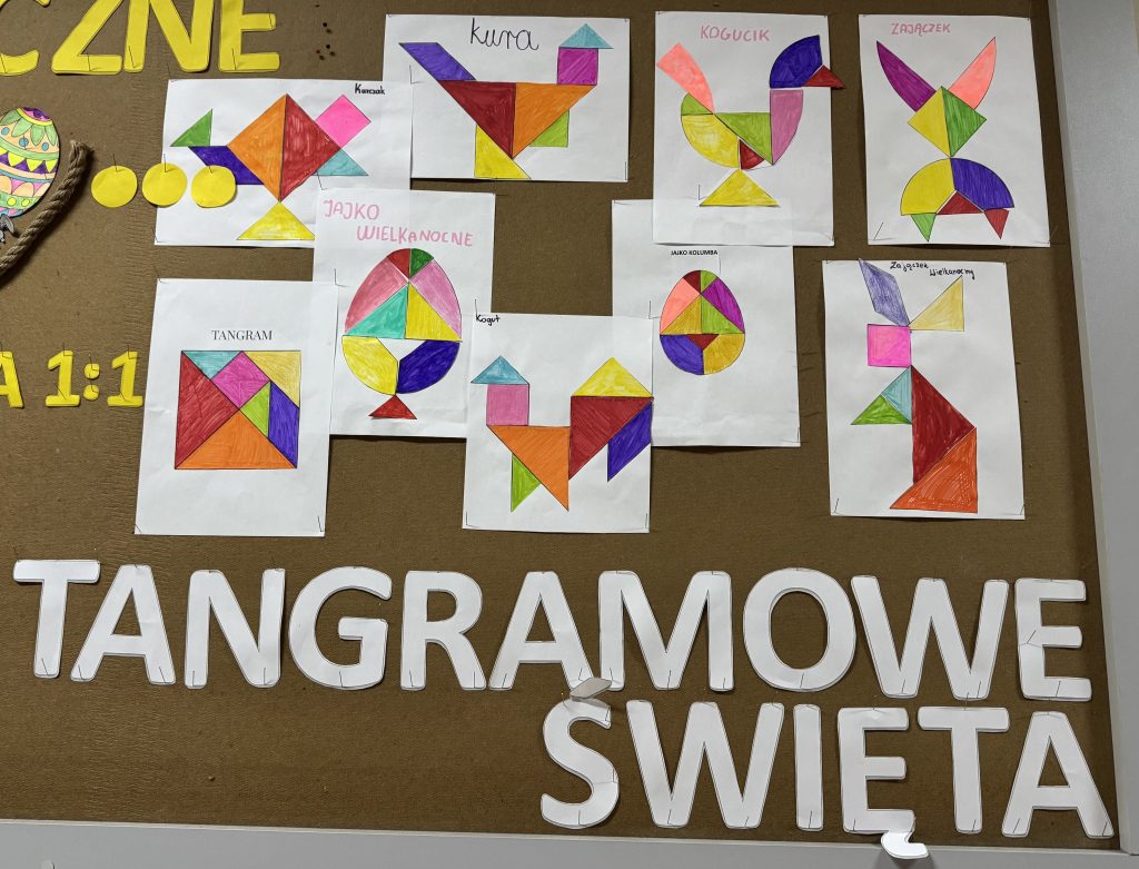 – zajączki, kurczaczki i jajka ułożone z tangramów – geometryczne puzzle, które pokazują, że matematyka może być sztuką!