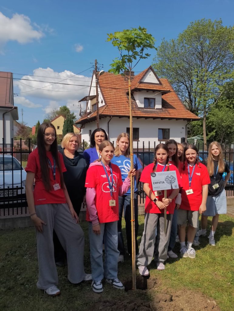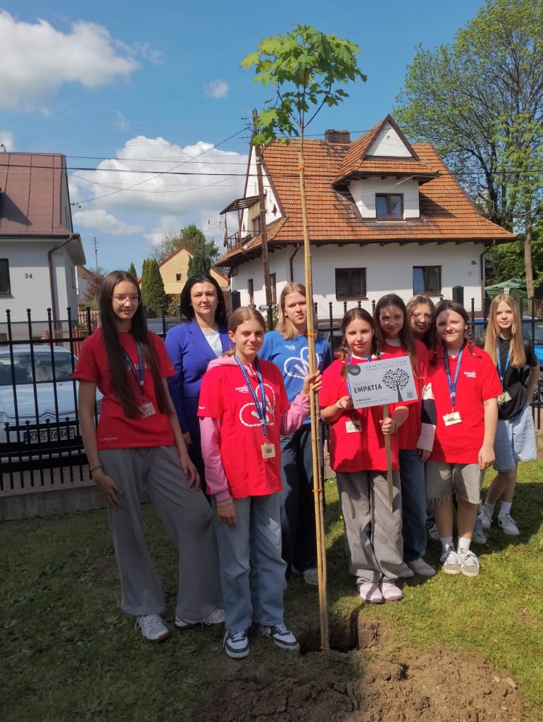 Wolontariusze posadzili symboliczne drzewo – jako znak solidarności, odpowiedzialności i troski o wspólne dobro oraz umieścili tabliczkę upamiętniającą to podniosłe wydarzenie. Na tabliczce znajduje się nazwa drzewa, symbolizująca konkretną wartość zakorzenioną w wolontariacie. Nasze drzewo otrzymało nazwę „EMPATIA” bo wolontariat to dostrzeganie drugiego człowieka i jego potrzeb, trwanie przy drugiej osobie, zwracanie uwagi na jej uczucia i potrzeby oraz pewność, że dobrze je rozumiemy, chociaż nie odczuwamy tego samego. Osoby empatyczne łatwiej wybaczają, szybciej i skuteczniej rozwiązują konflikty. Na tabliczce znajduje się również kod QR, który po zeskanowaniu kieruje na jubileuszową stronę Stowarzyszenia Sursum Corda.