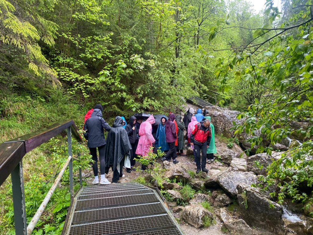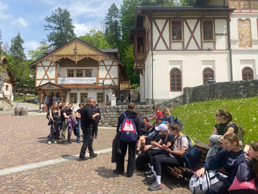 W dzień wyjazdu, czwartek 22 maja, przywitało nas piękne słońce, które towarzyszyło nam do końca dnia. Po przybyciu do Szczawnicy rozpoczęliśmy wędrówkę wzdłuż Dunajca, od stacji spływu łodziami do Pawilonu Edukacyjnego, gdzie obejrzeliśmy wystawę pt. ”Ekosystemy Leśne Pieniny”. Następnie czekał nas długi spacer wzdłuż potoku Grajcarek do centrum Szczawnicy, pod stację kolejki krzesełkowej na Palenicę. Po krótkim odpoczynku dotarliśmy do Pijalni Wód Mineralnych, pięknej wizytówce Szczawnicy. Nadszedł czas na zdobywanie górskich szczytów, czekał nas prawie dwugodzinny spacer do Bacówki PTTK pod Bereśnikiem. Widoki zapierały dech w piersiach, szczególnie pięknie widoczne, ośnieżone Tatry. Po dotarciu na miejsce był czas na zakwaterowanie i poznanie zasad obowiązujących w schronisku górskim. Potem, aż do zmroku, miło spędzaliśmy czas na integracji na świeżym powietrzu. Drugi dzień powitał nas niestety deszczem. Po zejściu do Szczawnicy pojechaliśmy do Wąwozu Homole, a następnie pod wodospad Zaskalnik. W drodze powrotnej do Starego Sącza zatrzymaliśmy się w Krościenku aby obejrzeć zabytkowy kościół pw. Wszystkich Świętych pochodzący z przełomu XIII/XIV wieku.