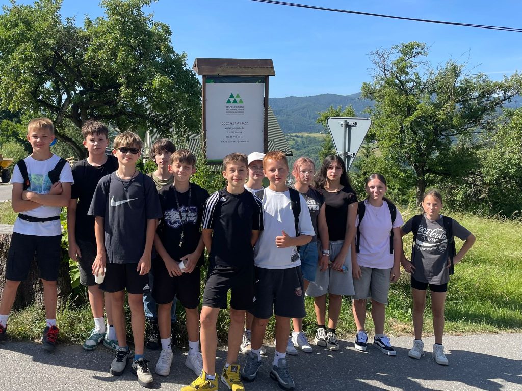 Gdy kończą się warsztaty w Zespole Parków Krajobrazowych Województwa Małopolskiego (Oddział Wola Krogulecka) udajemy się na górę Dzielnica, a tam podziwiamy malownicze krajobrazy na Pasmo Jaworzyny Krynickiej i Pasmo Radziejowej, oddzielonej przez płynący w dole Poprad. Smażymy kiełbaski na grillu przy platformie widokowej „Ślimak”, a potem udajemy się na wycieczkę ścieżką przyrodniczą „Het na Hore bez Skole”, czyli gdzieś w górę przez kamienie, by poznać drzewa, krzewy, rośliny i zioła rosnące na ternie Popradzkiego Parku Krajobrazowego. Skrzyp, krwawnik pospolity, wyka, mięta, świetlik łąkowy, przytulia czepna, grab, bez czarny, pokrzyk wilcza jagoda (Atropa belladonna), dereń, dzika czereśnia, macierzanka – to tylko jedne z wielu nazw roślin, które uczniowie poznali na ścieżce przyrodniczej. Wysłuchali również wielu ciekawostek o faunie i florze Popradzkiego Parku Krajobrazowego przekazanych im przez panią Annę Świsterską z Zespołu Parków Krajobrazowych Województwa Małopolskiego. Następnie leśną ścieżką przez Głęboki Jar zeszliśmy do Życzanowa i autobusem wróciliśmy do Starego Sącza, gdzie nadeszła pora na lody dla ochłody w Cukierni Jeziorek.