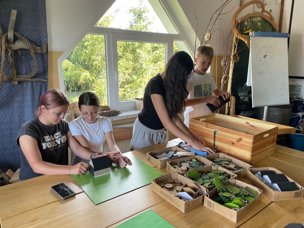 Uczniowie docierają na Wolę Krogulecką, gdzie w sali edukacyjnej mieszczącej się w siedzibie Zespołu Parków Krajobrazowych Województwa Małopolskiego (Oddział Wola Krogulecka) biorą udział w warsztatach pt. „Zrównoważony rozwój” prowadzonych przez panią Annę Świsterską, starszego specjalistę ds. edukacji w ZPKWM – Oddział Wola Krogulecka. Uczniowie poznają najpierw różnicę między parkiem narodowym, a parkiem krajobrazowym; a następnie zastanawiają się nad tym, z czym kojarzy im się słowo „krajobraz”, by później przejść do zadania praktycznego, które wykonywali w trzyosobowych grupach. Każda z grup otrzymała bowiem działkę, a ich zadaniem było zaprojektowanie domu i ogrodu przyjaznego naturze, który znajduje się na terenie parku krajobrazowego i który harmonijnie komponuje się ze starosądeckim krajobrazem. Uczniowie musieli podjąć decyzje dotyczące wysokości budynku, odpowiedniej odległości od cieku wodnego, wybrać elewację domu, odpowiedni dach, typ chodnika, ogrodzenia, dodatkową infrastrukturę (m.in. altanki, ogniwa fotowoltaiczne, kompostownik, jaskółki na dachu, garaże itp.) Powstały ciekawe projekty domów i ogrodów przyjaznych naturze. Uczniowie dowiedzieli się o zaletach planowania grządek obok drzew owocowych, żywopłotu bukowego lub grabowego (czyli z rodzimych gatunków drzew); wiedzą już jak wygląda żywotnik zachodni, który nie jest gatunkiem rodzimym. Każda grupa na koniec zaprezentowała swoje przyjazne naturze rozwiązania, które wykorzystali projektując dom i ogród. Po intensywnych warsztatach na uczniów klasy 6a czekały kolejne atrakcje sprzyjające integracji i edukacji.