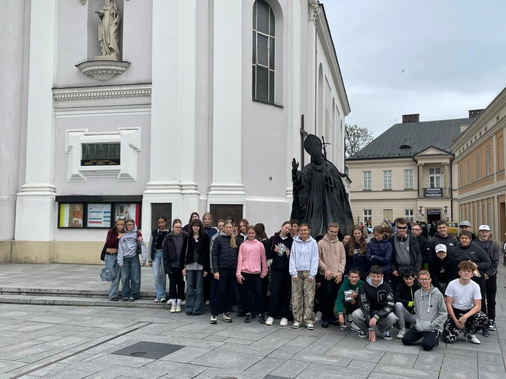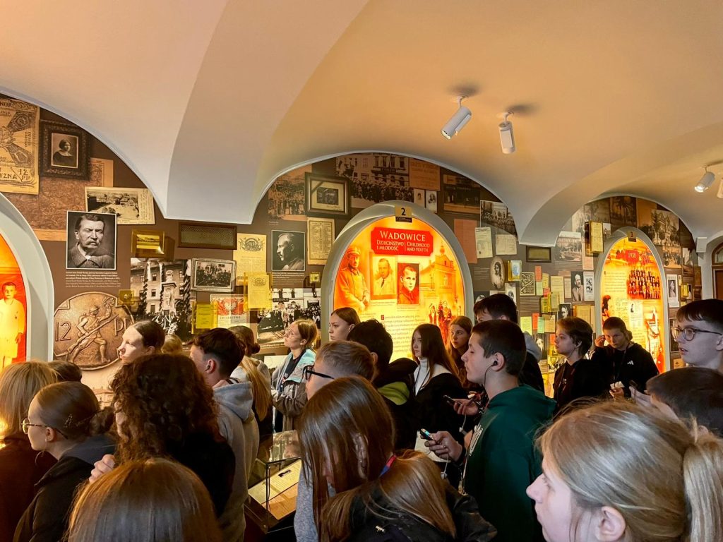 „To są górskie okolice. To jest moje miasto Wadowice…”- słowa te rozbrzmiewają w myślach naszych ósmoklasistów na wadowickim rynku, wokół którego znajdują się kawiarenki serwujące słynne kremówki. To właśnie w Wadowicach rozpoczyna się dzisiejsza programowa wycieczka ósmoklasistów. Po wizycie w Papieskiej Bazylice Ofiarowania NMP, uczniowie udali się na zwiedzanie Muzeum Domu Rodzinnego Ojca Świętego Jana Pawła II, w którym nie bez wzruszenia wyrusza się w symboliczną podróż przez wyjątkowe życie Świętego Jana Pawła II od narodzin aż do śmierci. Szczególnie wzruszający jest moment, gdy wchodzi się do przyciemnionej sali, w której słysząc bicie ludzkiego serca nad Pismem Świętym czytanym Ojcu Świętemu w ostatnich momentach życia spogląda się na wyświetlane i kolejno przemijające zdjęcia twarzy Jana Pawła II od narodzin aż do tego ostatniego zdjęcia ukazującego twarz cierpiącego już Ojca Świętego.