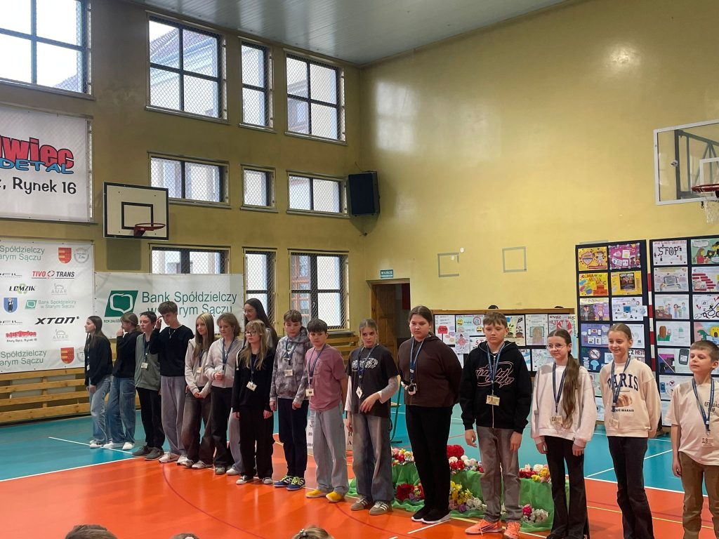 Uczniowie klas siódmych wraz z nauczycielami koordynującymi galę finałową: panią Teresą Tokarczyk, panią Małgorzatą Koszyk oraz panią Beatą Damasiewicz przygotowali przedstawienie pod tytułem „Zanim napiszesz – pomyśl. Słowa mają moc, hejt rani”.